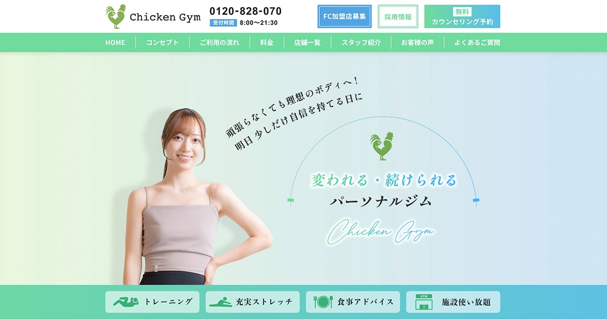 流山おおたかの森駅徒歩1分にあるチキンジム。経験豊富なトレーナーがマンツーマンでオーダーメイドのトレーニングを提供し、管理栄養士による食事指導やウェア・シューズのレンタル、施設利用が可能です。営業時間は7:00〜23:00で通いやすい環境です。