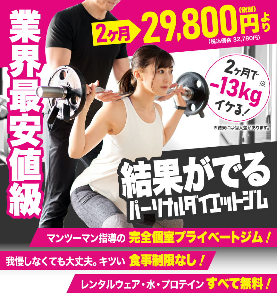 JR甲子園口駅近くにある完全個室のパーソナルジム。2ヶ月29,800円〜のマンツーマン指導で食事サポートを提供し、ウェア・タオル・シューズ・プロテインが無料で手ぶらで通える低価格店舗です。