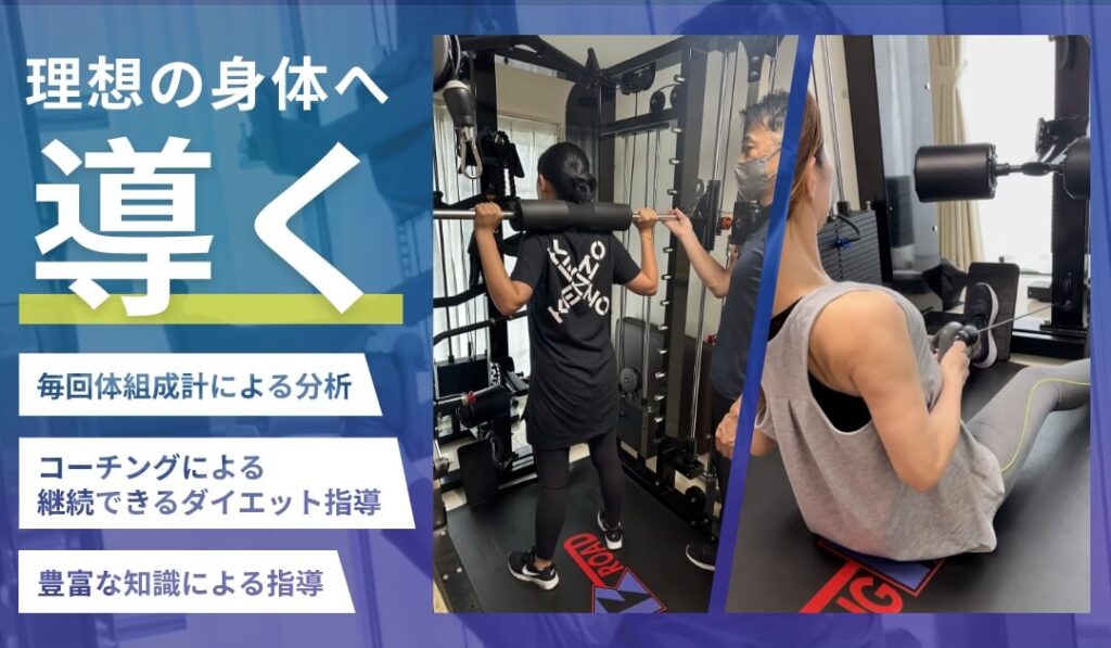 阪急西宮北口駅から徒歩5分の完全予約制パーソナルトレーニングジム。最新機器を備えたプライベート空間でマンツーマン指導と食事アドバイスを提供します。