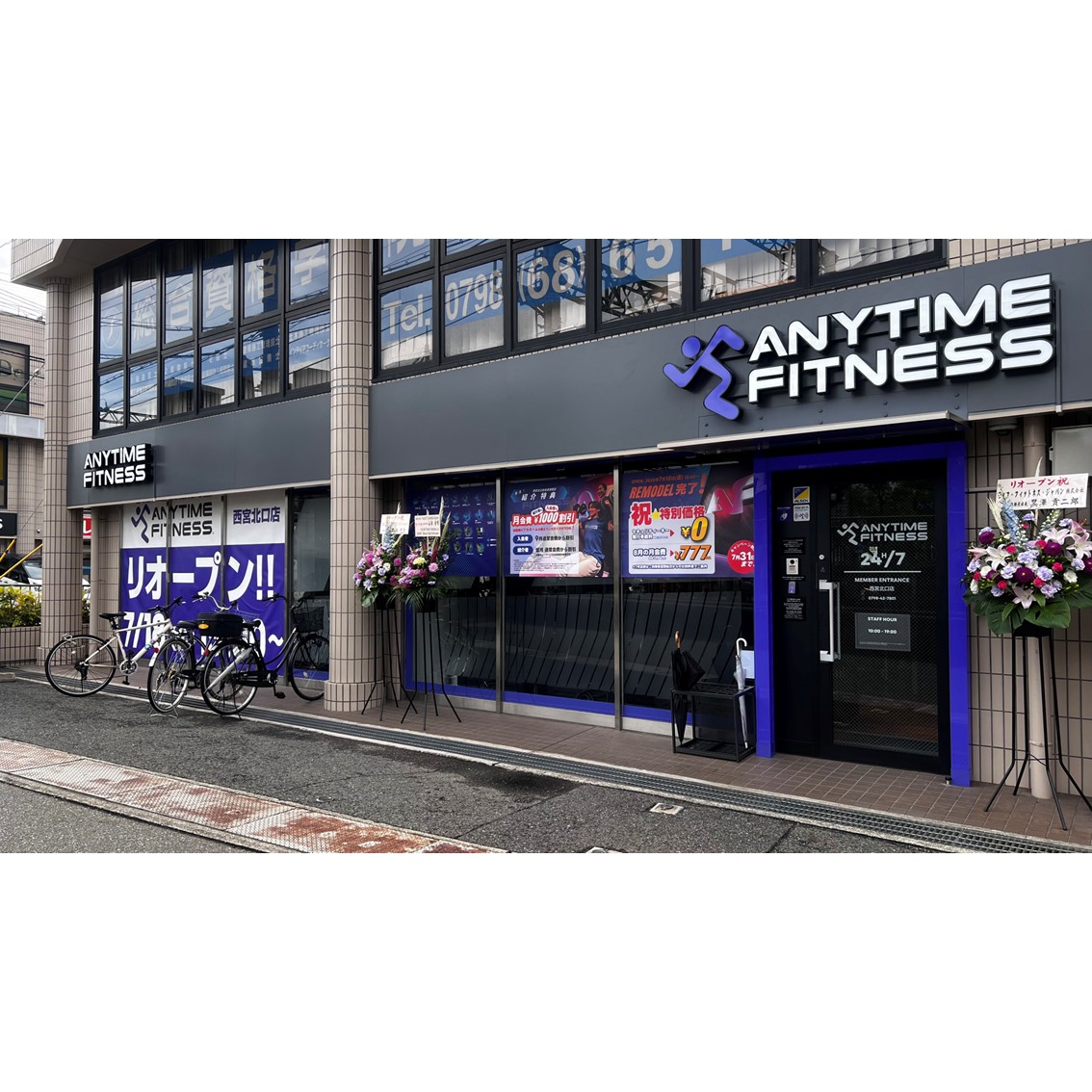 西宮北口駅から徒歩5分のエニタイムフィットネス西宮北口店。24時間利用可能なマシン特化型ジムで、スタッフ受付は10:00~19:00。入会キャンペーンやセキュリティキー発行手数料5,500円(税込)の案内があります。