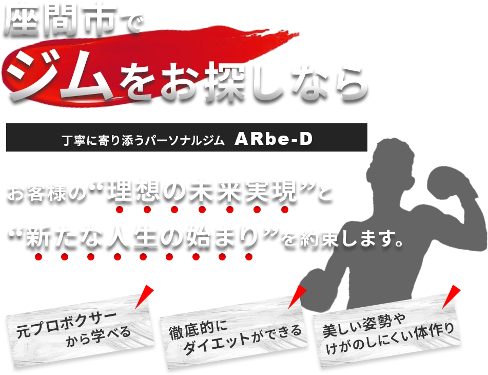 座間市相模が丘のパーソナルジム。元プロボクサーのトレーナーがマンツーマンでオーダーメイド指導を行い、ダイエットやボディメイク、スポーツ能力向上に合わせた都度払いや4〜12週の集中コース、食事指導を提供します。