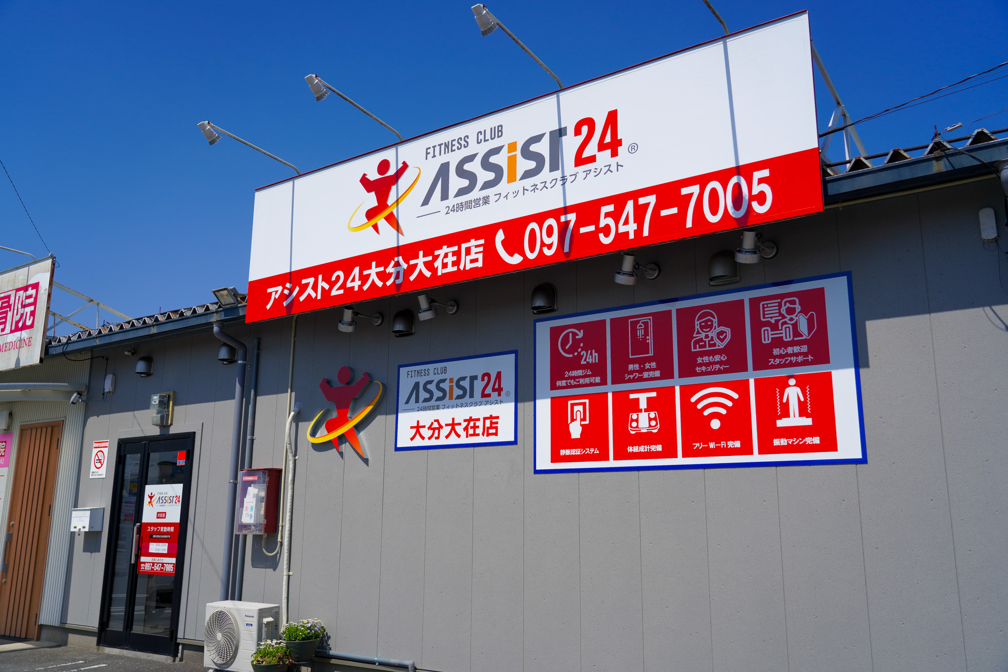 アシスト24大分大在店は24時間営業の低価格フィットネスクラブです。指紋認証による入退室管理でセキュリティを確保し、シャワー・ロッカー完備。スタッフ常勤時間には施設案内や無料見学・体験、トレーニングのサポートを行います。