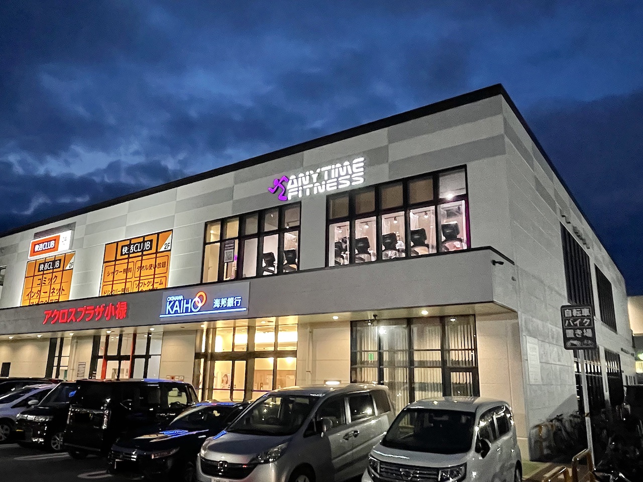 那覇市鏡原町アクロスプラザ小禄2Fにあるエニタイムフィットネス鏡原店。24時間営業のマシン特化型ジムで、個室シャワーや契約ロッカーを備え、スタッフアワーは10:00〜19:00。会員は施設共有駐車場3時間無料。奥武山公園駅から徒歩8分。