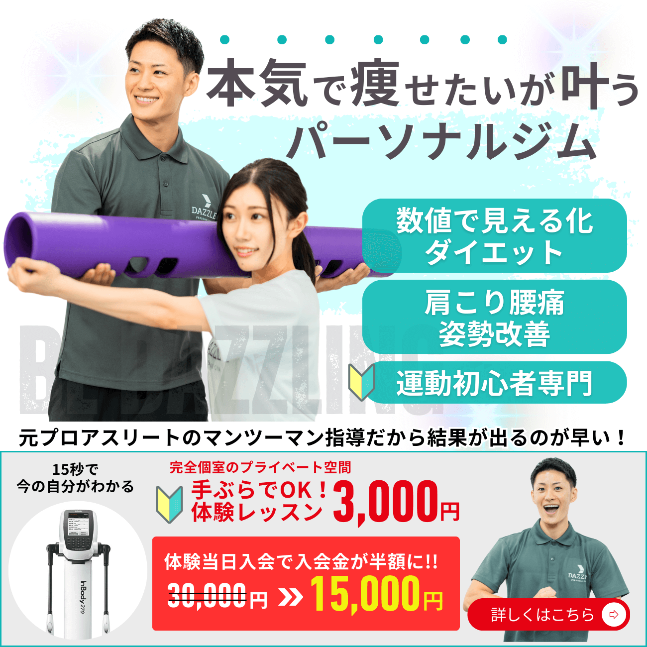 門前仲町駅徒歩2分の完全個室パーソナルジム。元プロ選手によるマンツーマン指導と管理栄養士の食事サポート、InBodyで体組成を数値管理。手ぶらOKで子連れ利用も可能です。