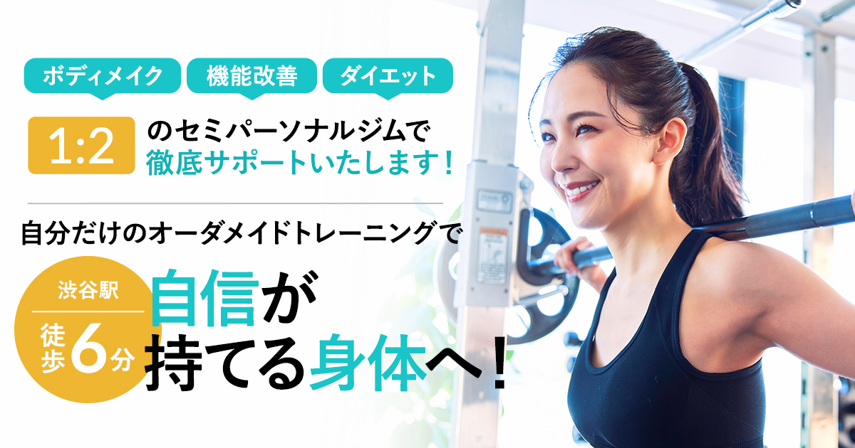 渋谷駅徒歩7分の完全個室パーソナルジム。都度払いで60分のマンツーマントレーニングを提供し、有資格トレーナーが生活習慣に合わせた食事指導と個別プログラムを行います。初回体験無料でレンタルも充実しています。