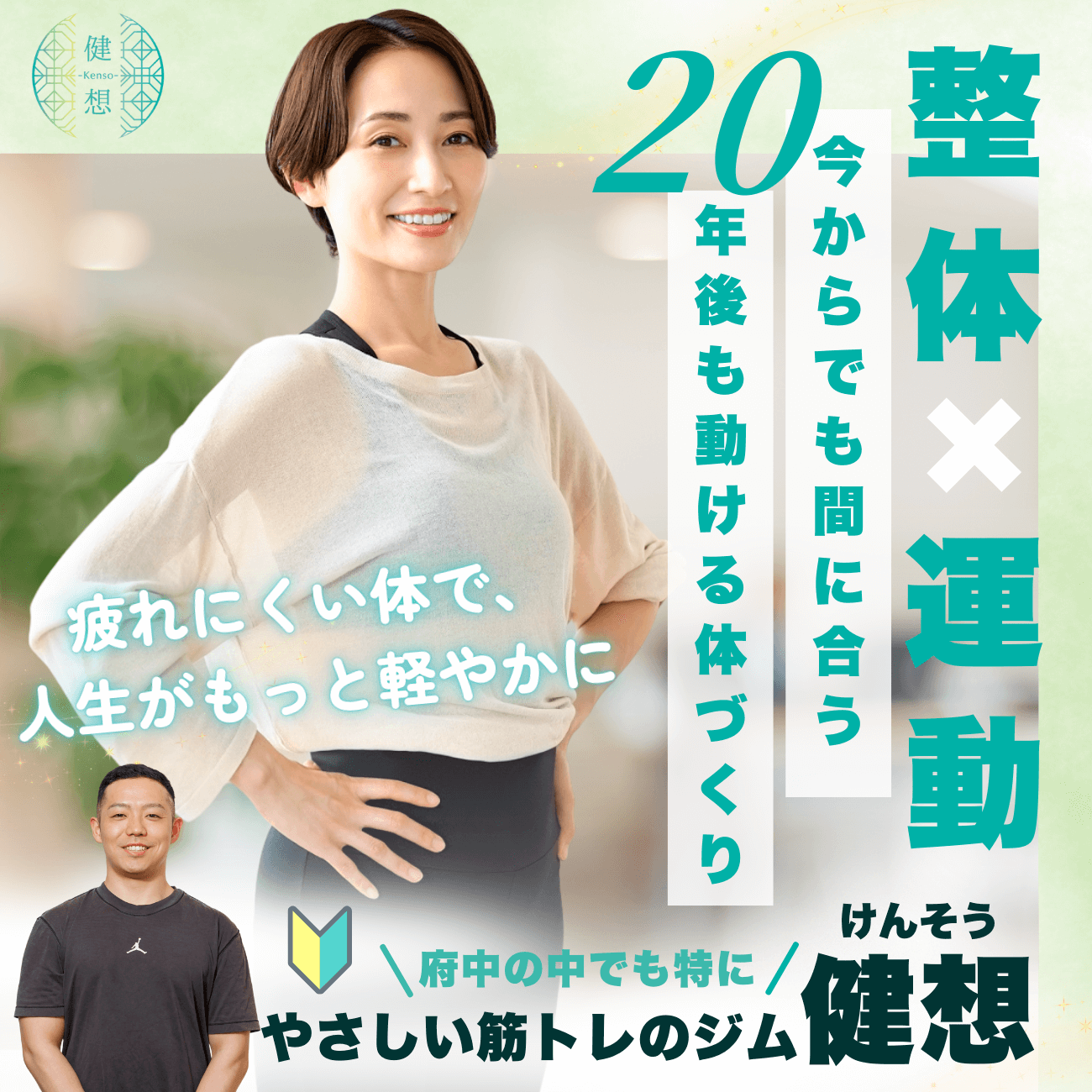 府中のパーソナルジム健想は、整体で体を整えてから行うマンツーマントレーニングを提供。中高年の腰痛・膝痛や姿勢改善に強く、臨床経験あるトレーナーが個別に指導。子連れ利用や更衣・ロッカー完備で通いやすい点も特長です。