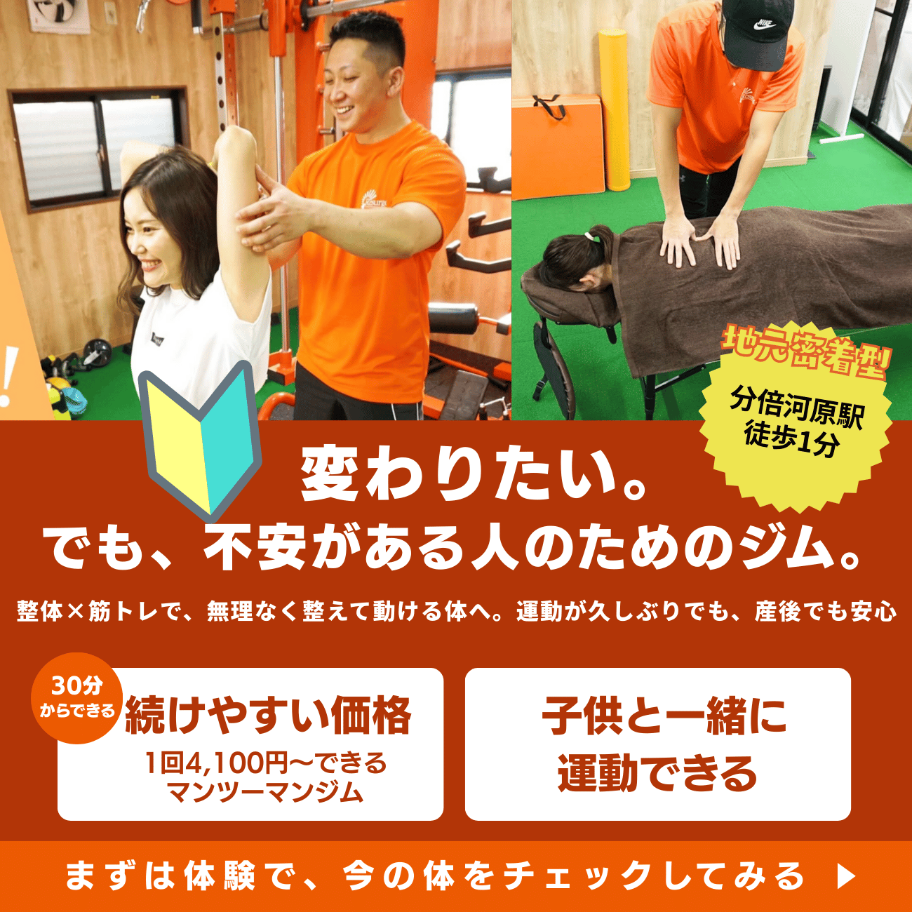 分倍河原駅から徒歩1分の完全個室パーソナルジム。1回4,500円〜の低価格でマンツーマン指導と栄養食事指導を提供し、お子様連れも歓迎。短期集中プランや継続サポートでリバウンド対策まで行います。