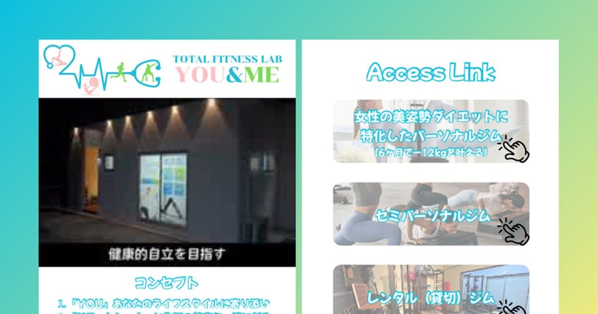 東海市名和町のパーソナルジム。75分の完全予約制マンツーマンで身体を整えてから鍛える方針。ボディメイクや食事指導付きのトータルサポート、昼割や回数券、月額4回プランを用意。子連れ可・駐車場完備・無料体験あり。