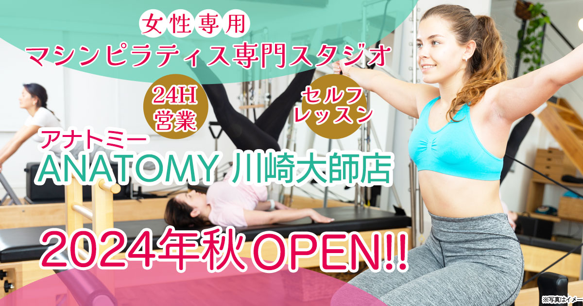 ANATOMY川崎大師店は女性専用のマシンピラティススタジオ。24時間営業でリフォーマーを設置し、セルフ動画による受講と契約トレーナーによるマンツーマン指導(オプション)を提供。更衣室・シャワー・ロッカー・駐車場を完備。