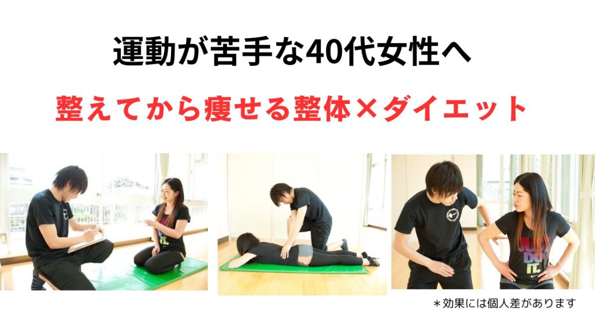 栃木県足利市の完全予約制プライベートジム。40代女性を主対象に、整体で歪みを整え筋トレで引き締める50分のマンツーマン指導を提供。高額サプリ販売はなく駐車場1台完備。