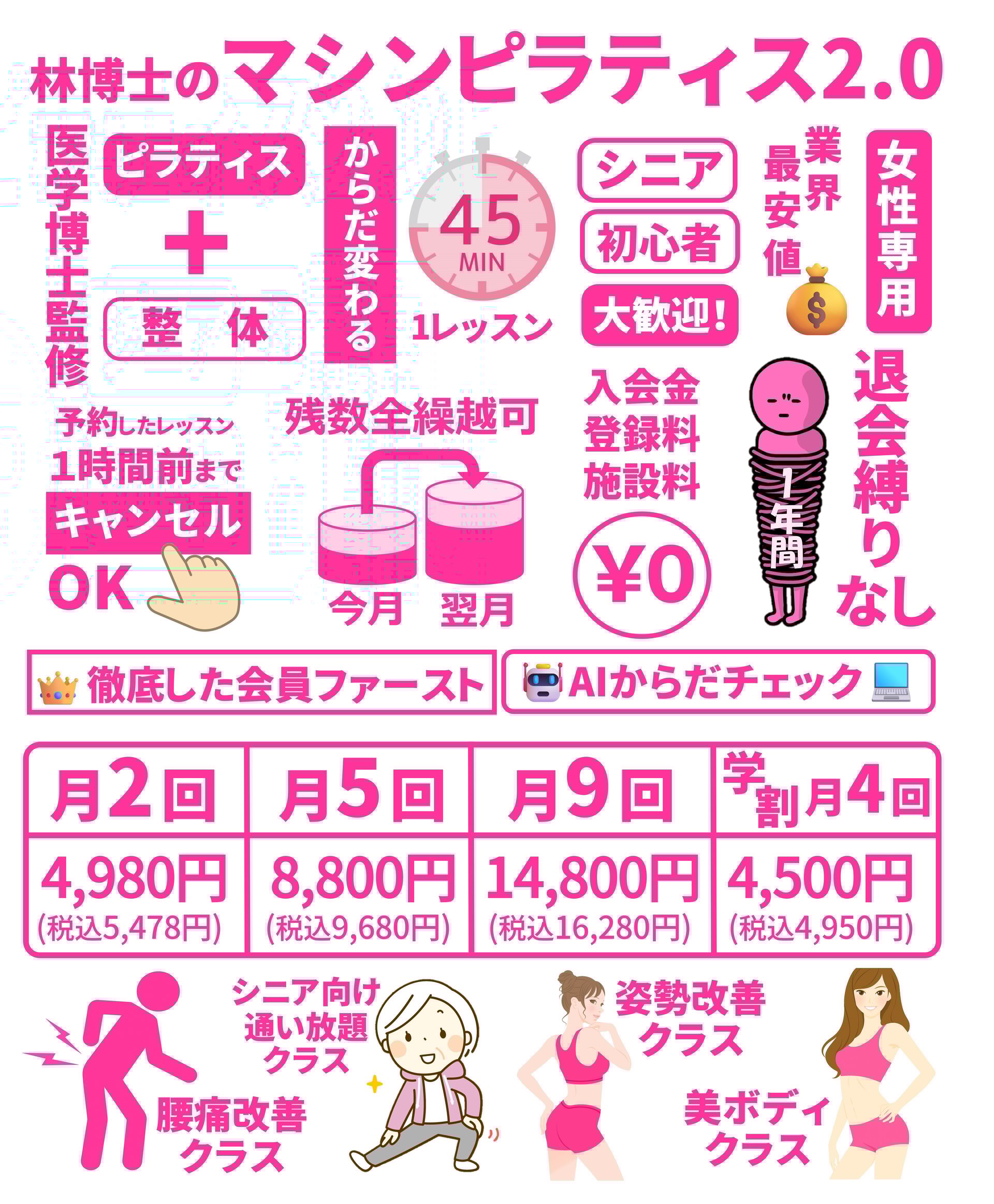 女性専用のマシンピラティス(リフォーマー)を用いるセミプライベートスタジオ。姿勢改善や柔軟性向上、痛み軽減を目的にしたプログラムとAI姿勢診断を導入し、初心者やシニアにも対応。無料体験会を定期開催し、専用シューズやグローブの購入が必要。
