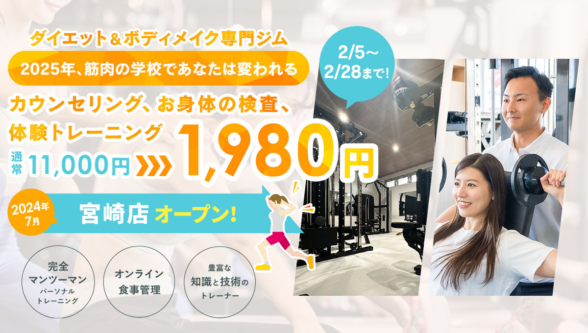 宮崎市吉村町のパーソナルジム。完全個室で専属トレーナーによるマンツーマン指導とオンライン食事管理、痩身EMSを組み合わせ、短期〜長期コースで結果に導く低価格のサービスです。駐車場完備で通いやすく、体力や目的に合わせた柔軟なプランを提供します。