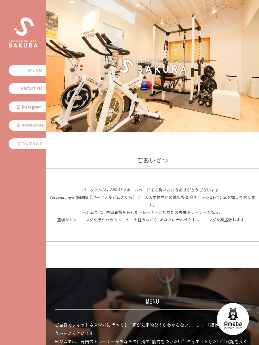 大阪市福島区吉野の鍼灸整骨院さくら2Fにあるパーソナルジム。国家資格を持つ専属トレーナーが1対1で個別メニューを作成し、30分・60分のマンツーマン指導とカウンセリング、トレーニング後のアドバイスを行います。